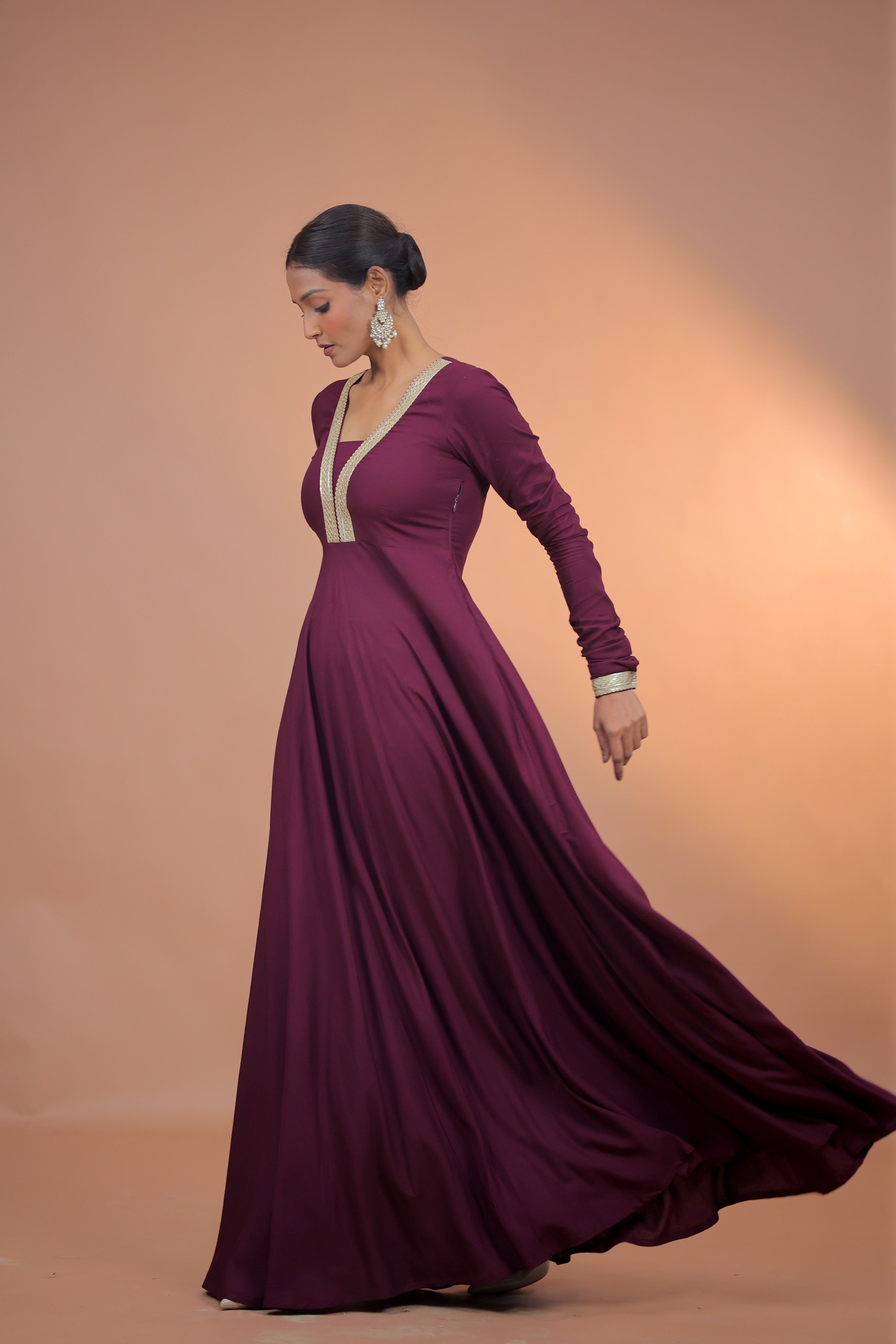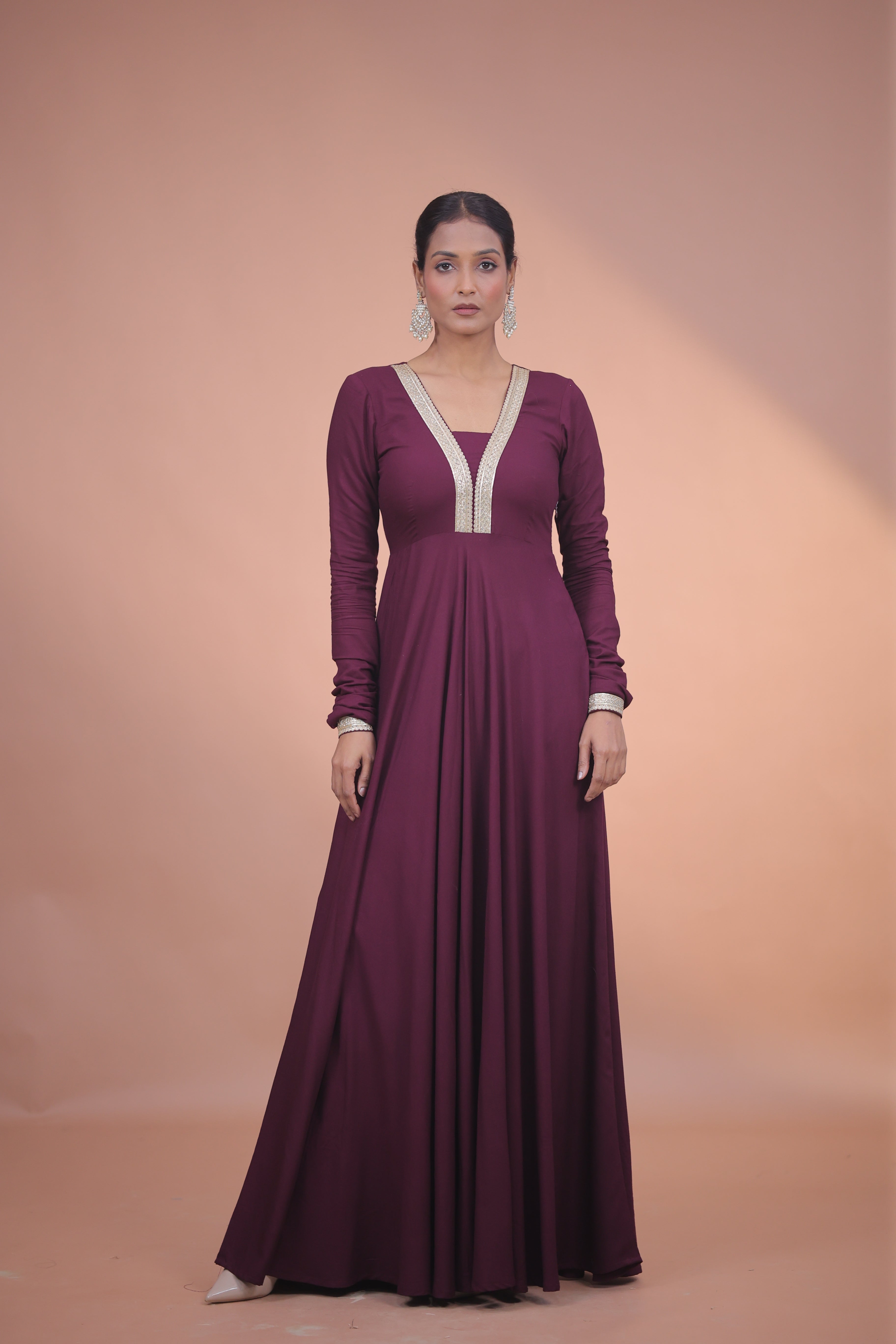 A flowing wine-hued anarkali highlighted with delicate neckline detailing for a refined finish.