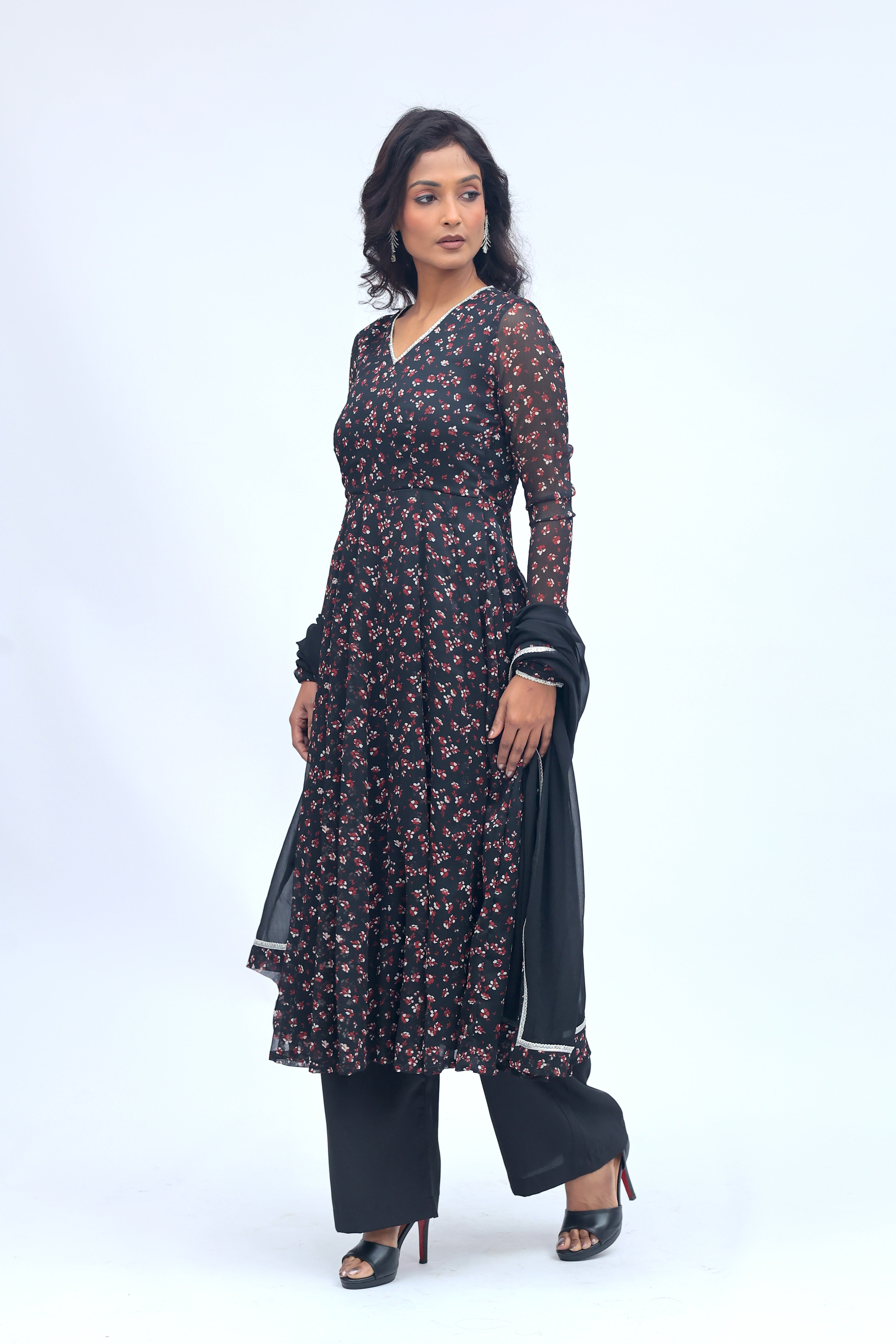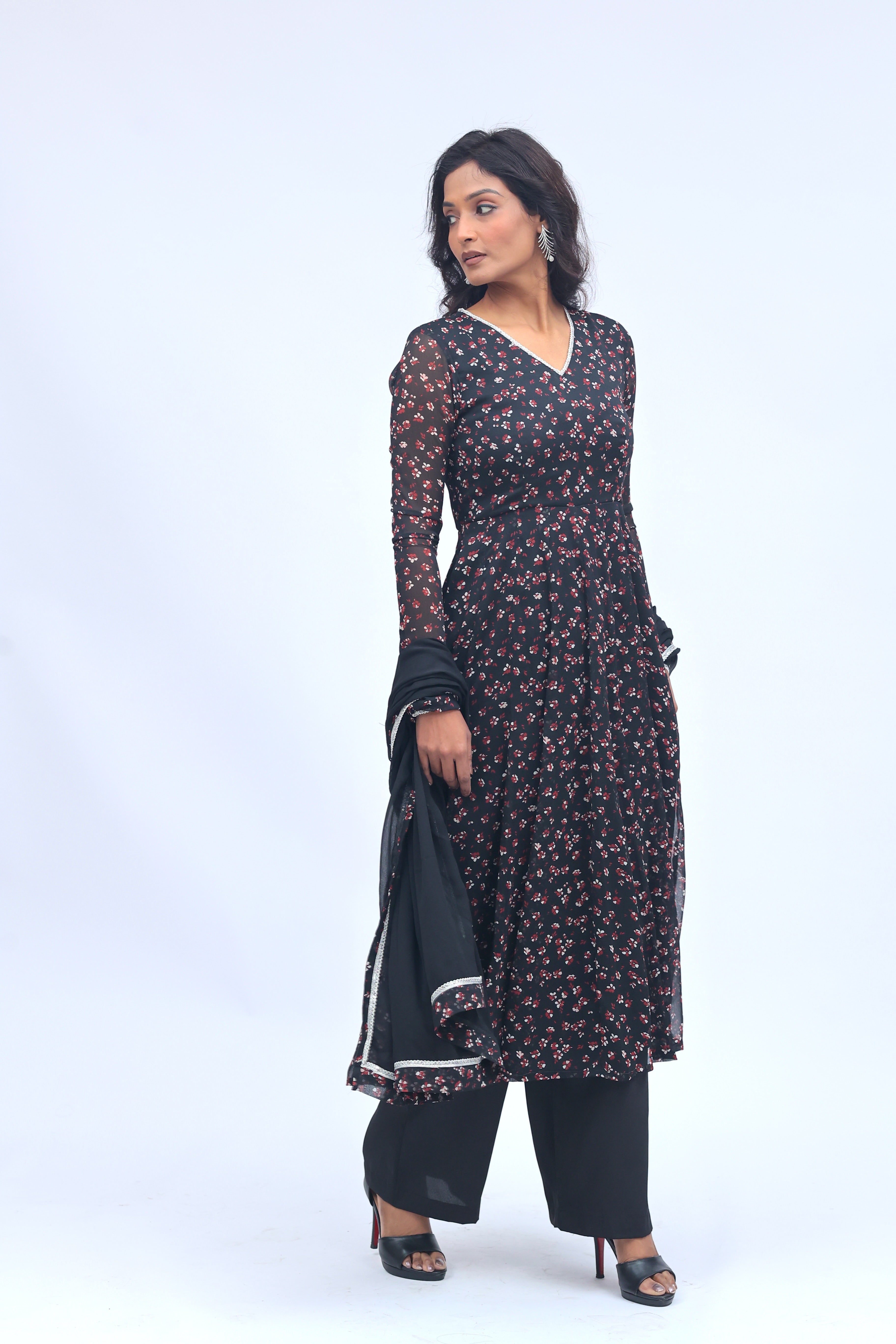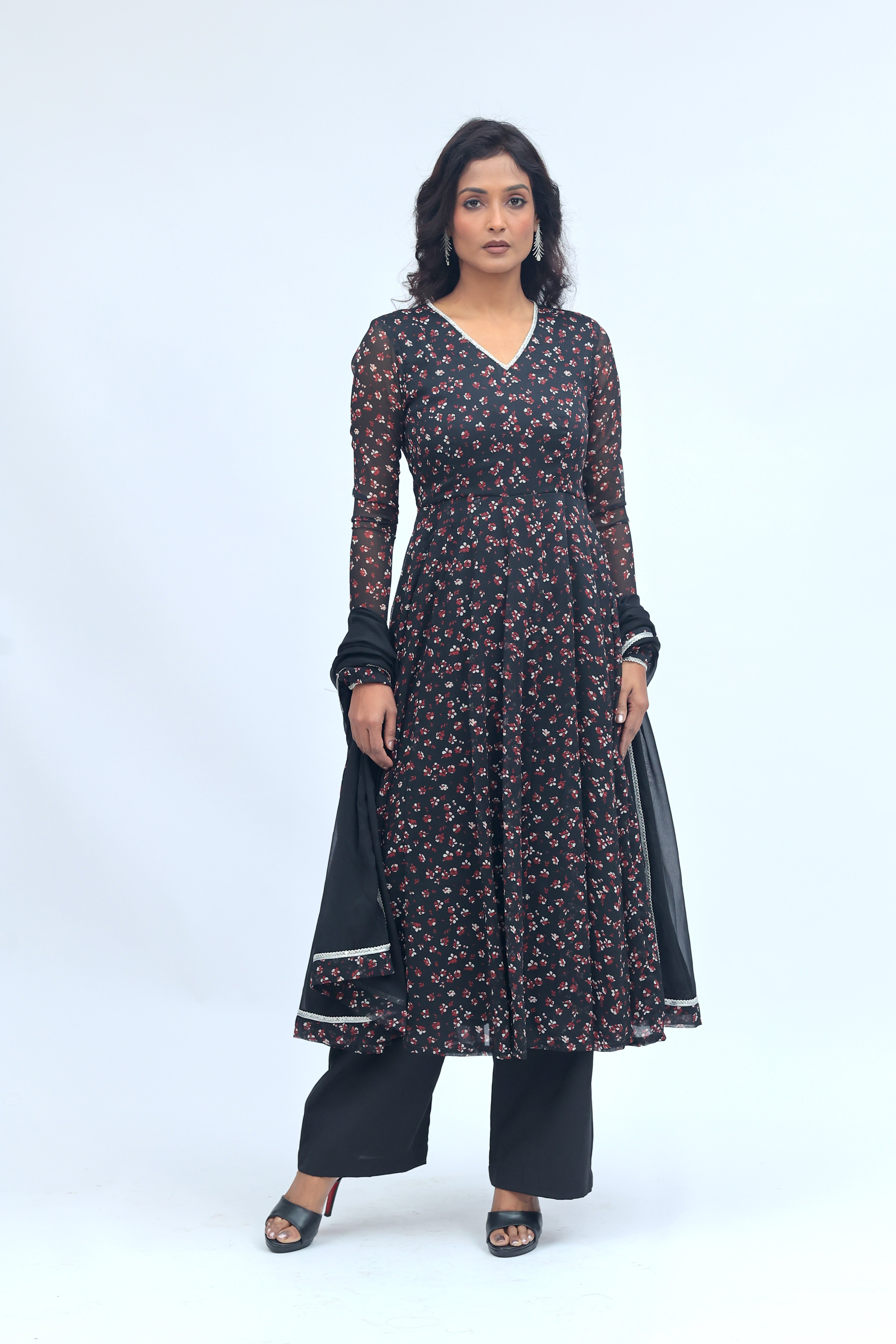 A graceful Anarkali featuring fine floral detailing on a black base, paired with matching bottoms and a light dupatta. Designed for comfort and versatility, ideal for festive dinners and cultural gatherings.