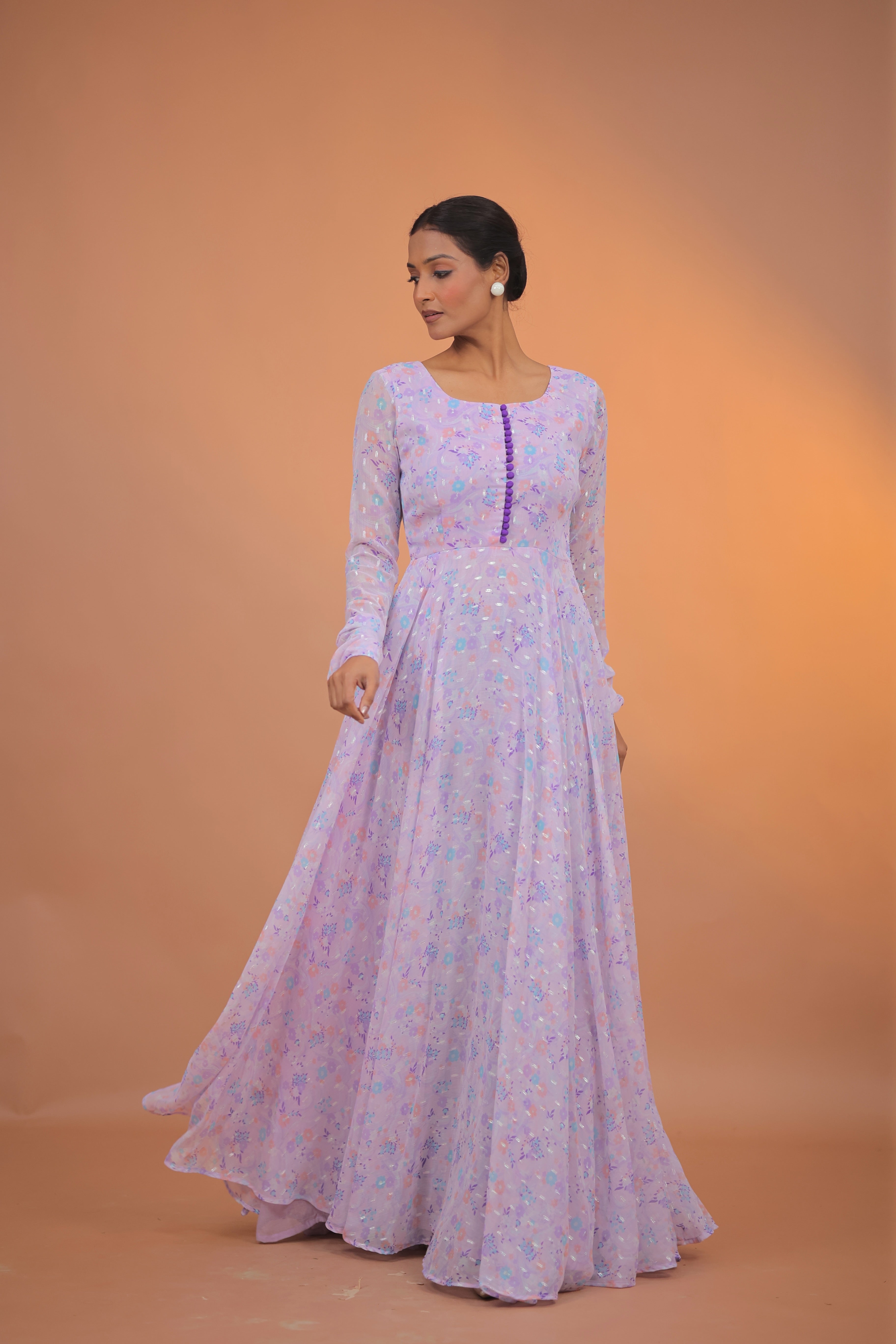 Pastel lavender floral anarkali paired with a flowy dupatta, designed for effortless elegance and movement.
