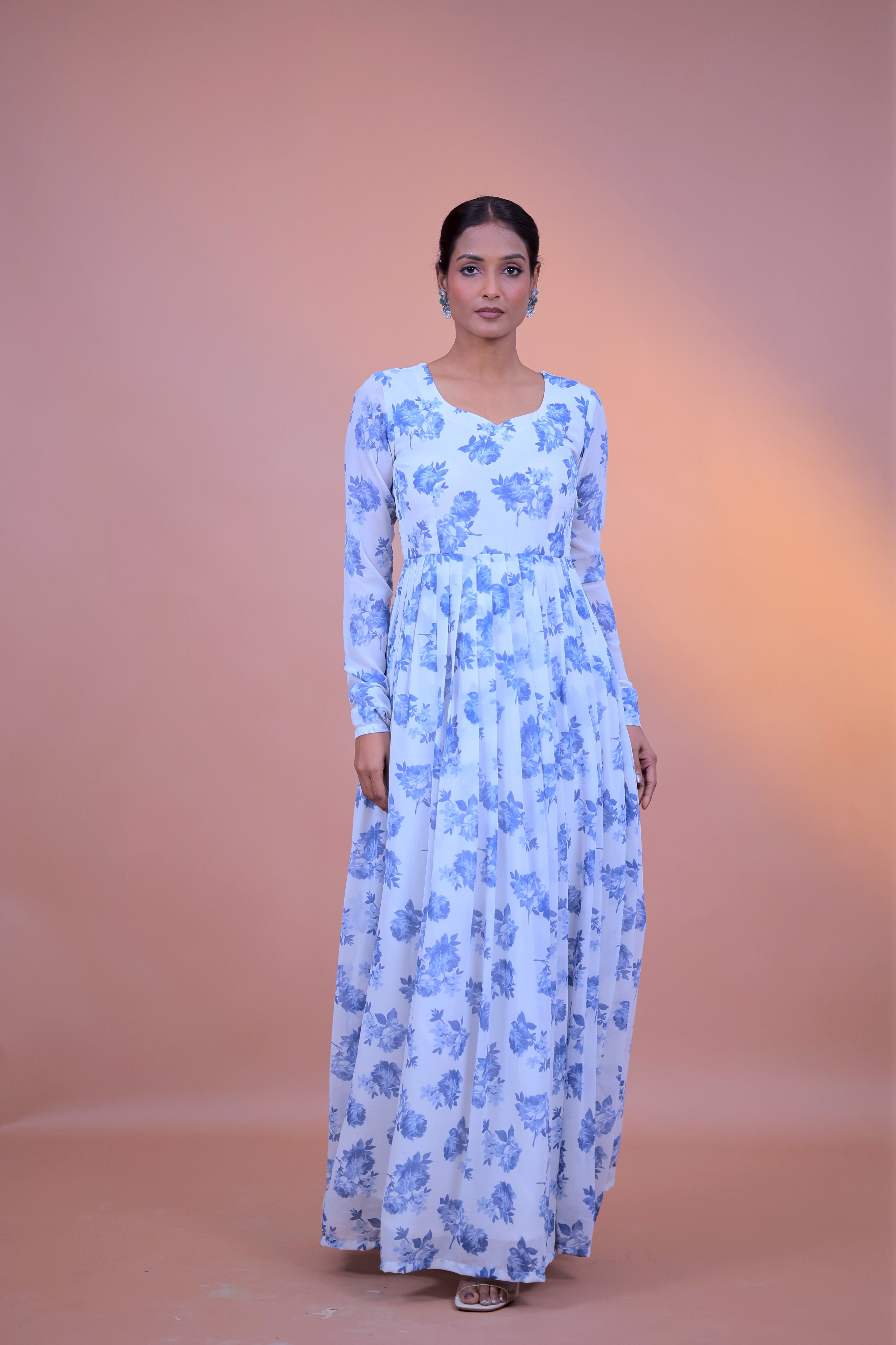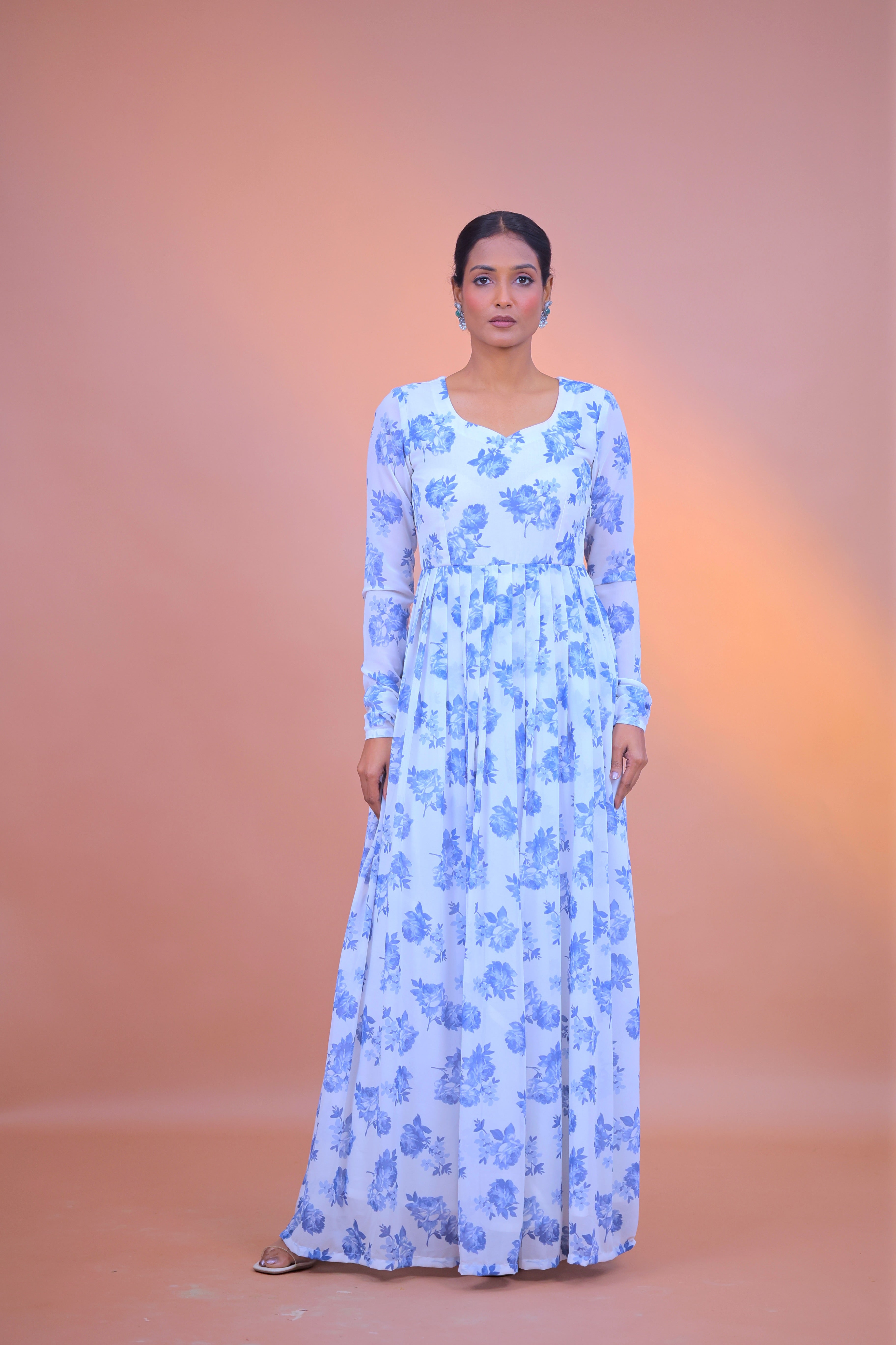 A timeless Anarkali crafted in a soft ivory base with delicate blue floral motifs. Designed with a graceful V-neckline and flowing silhouette, this piece brings effortless elegance with every movement.