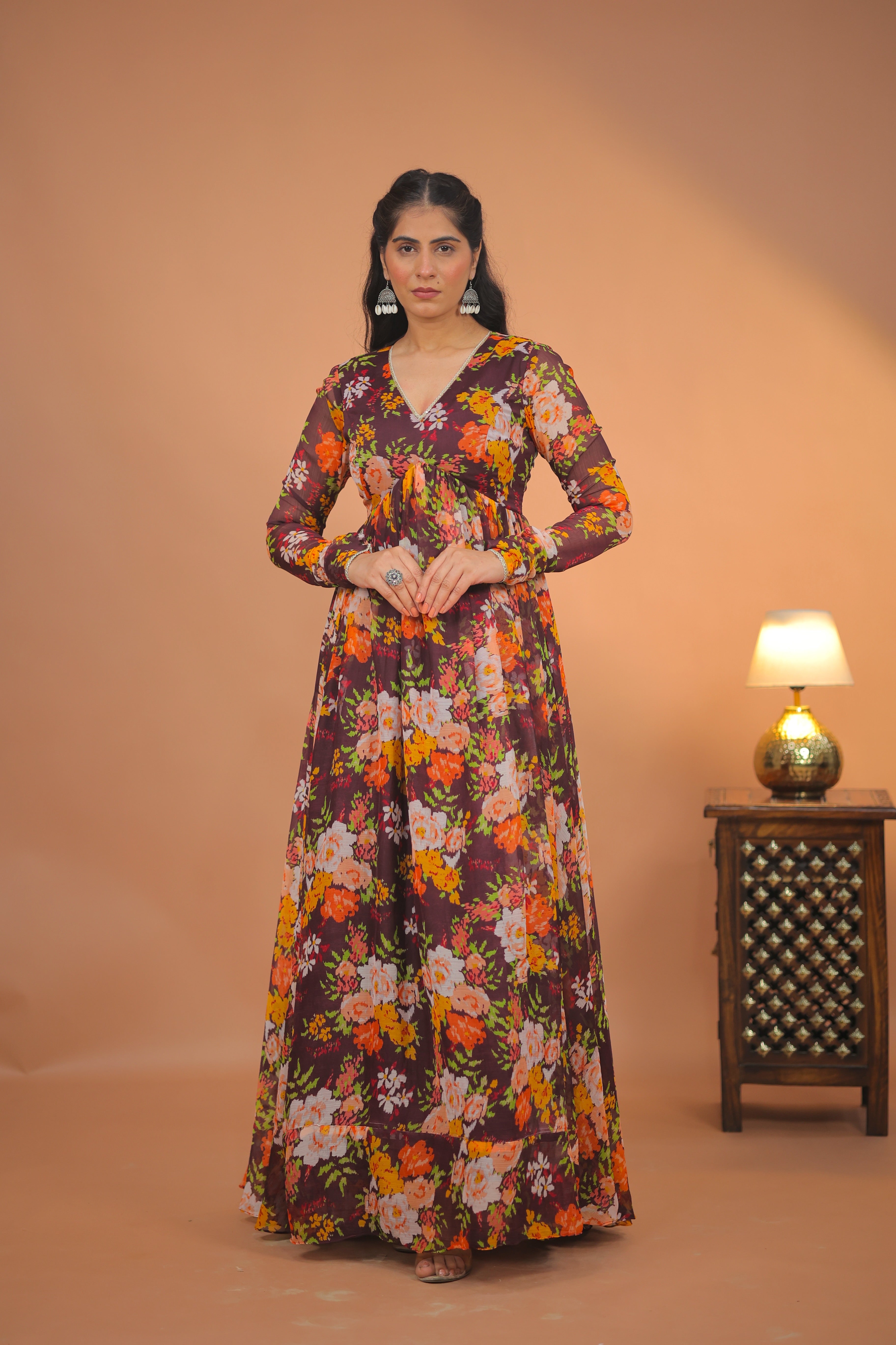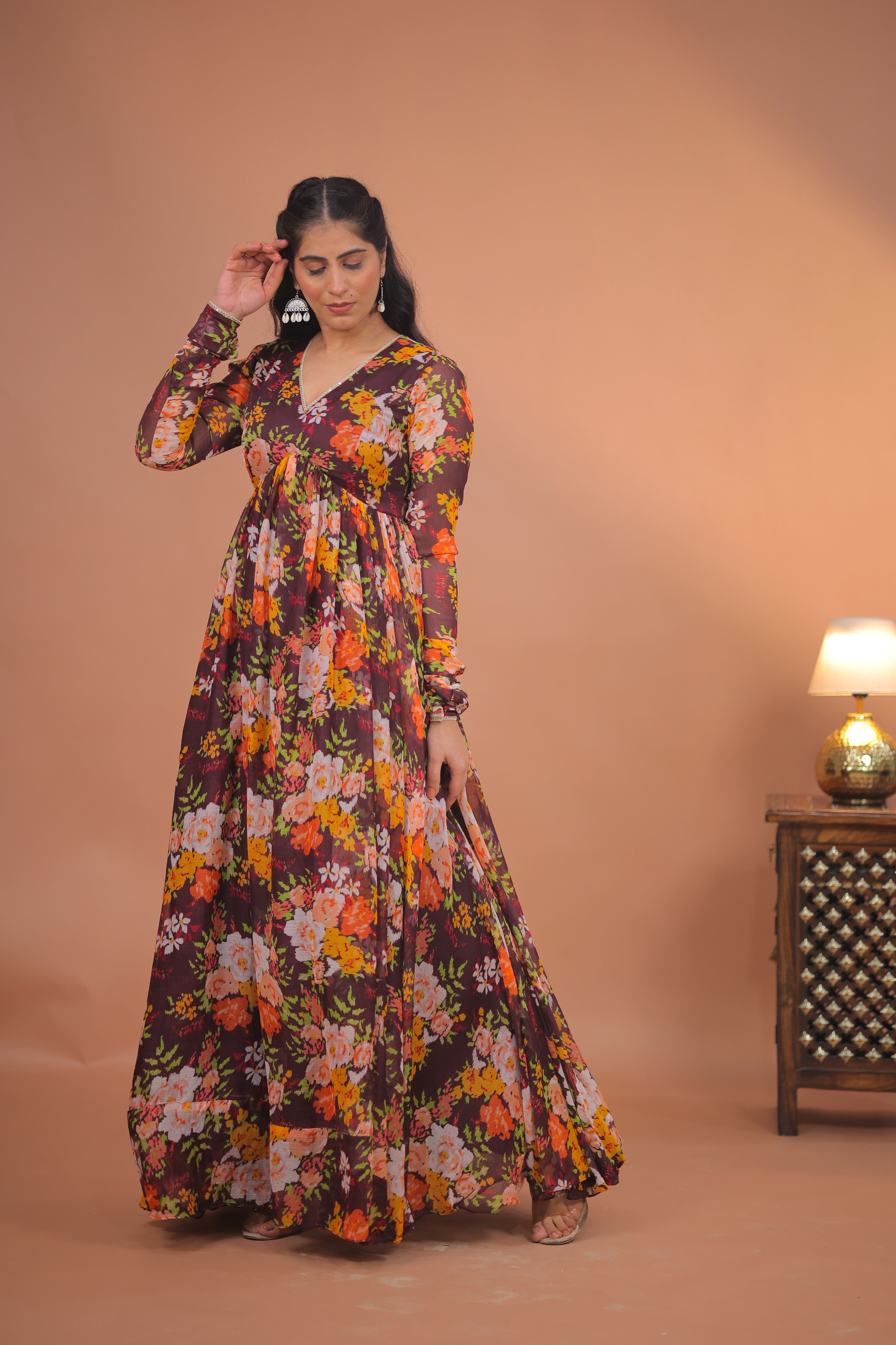 A rich floral anarkali in warm earthy tones with a graceful flow.
