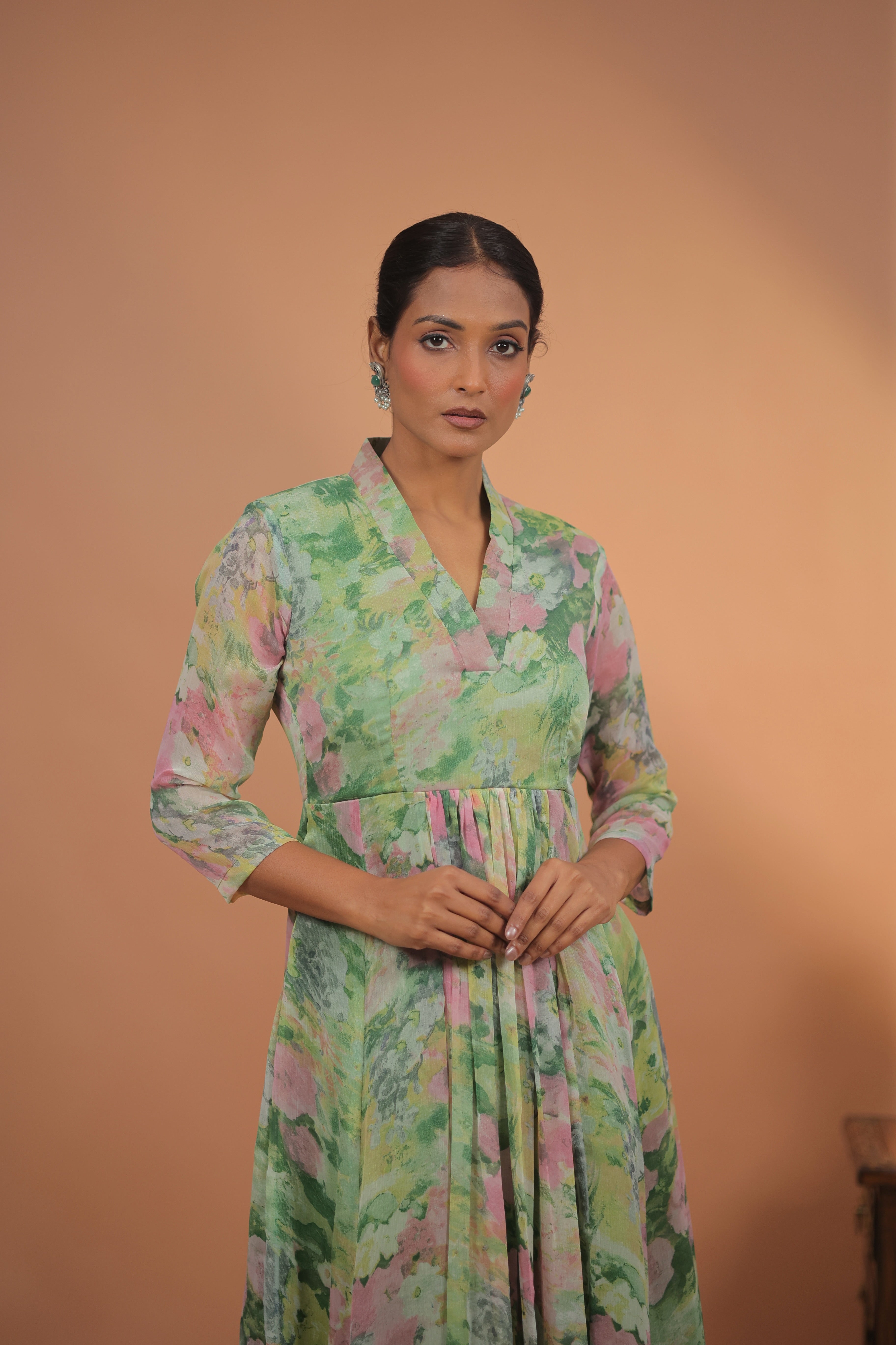 Soft pastel florals on a refreshing mint base with an easy, flowing drape.