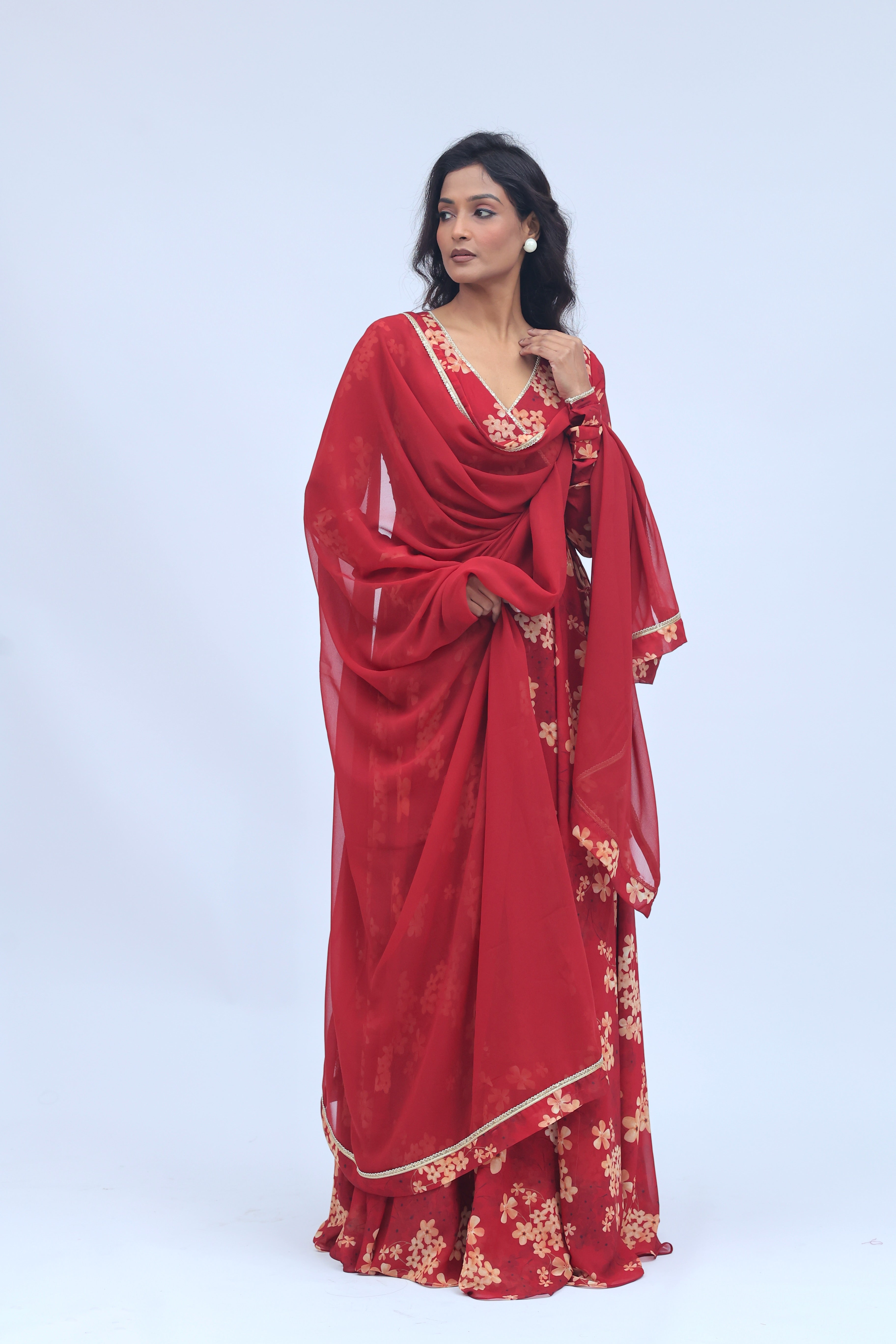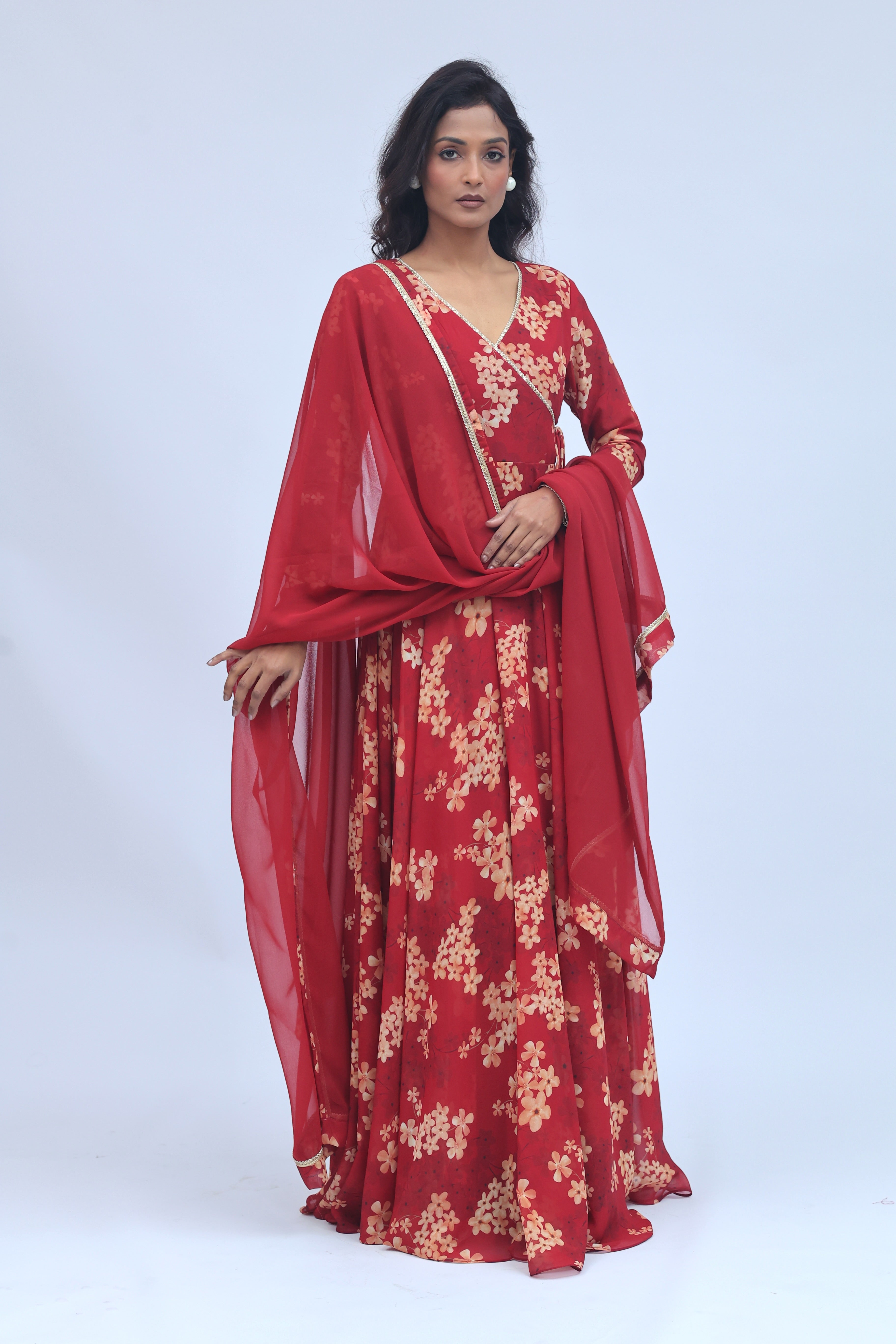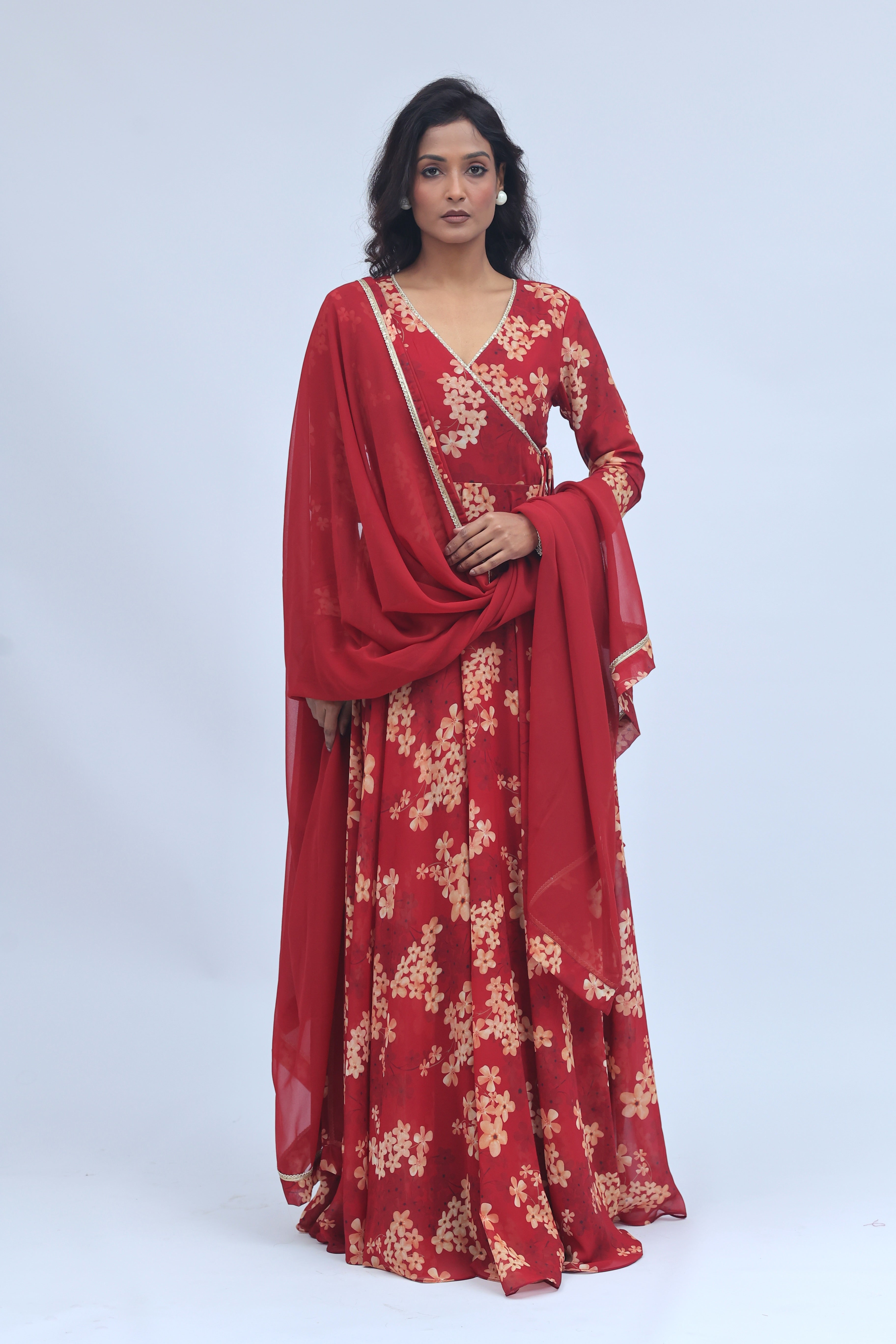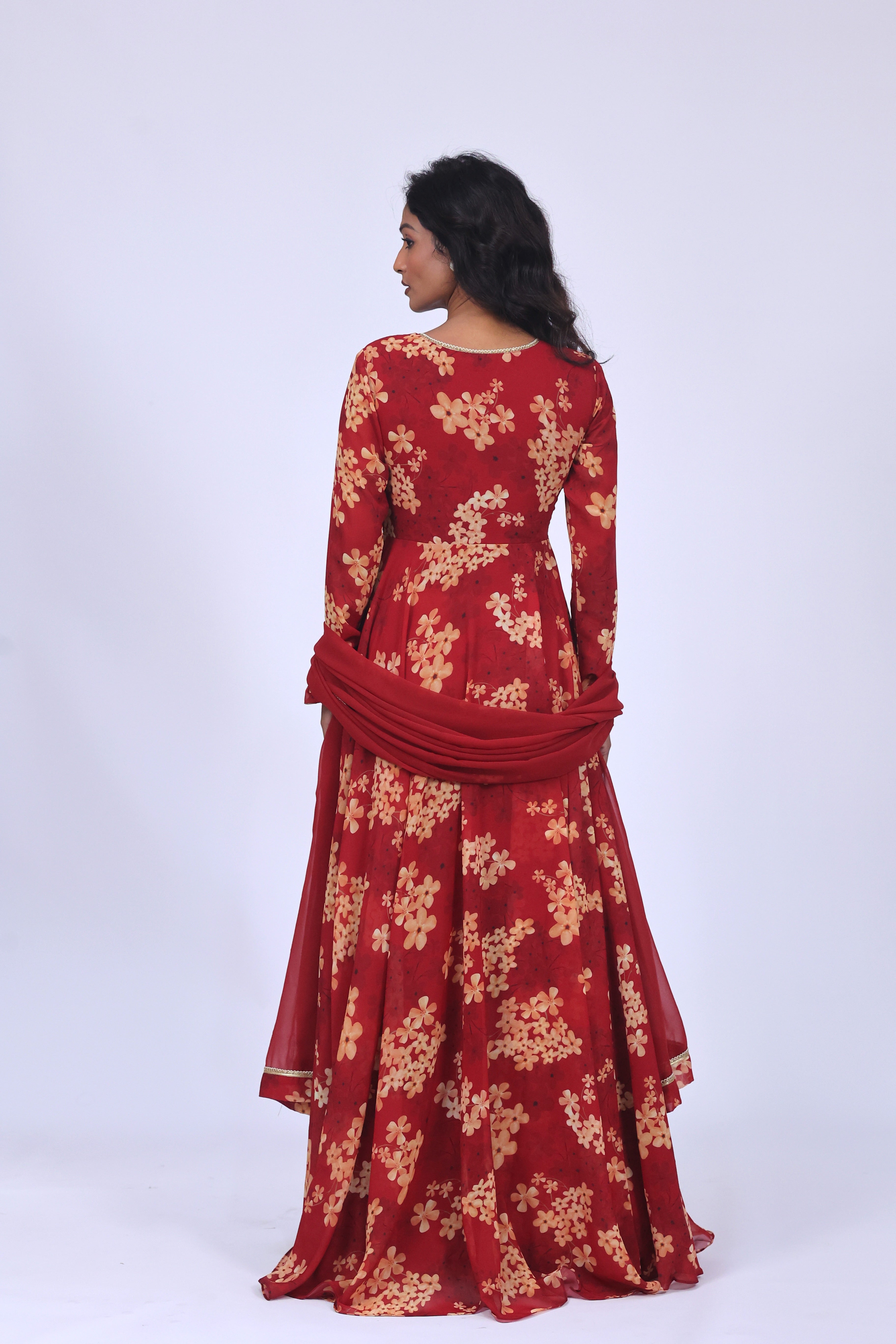 Crafted in a rich red hue with delicate floral prints, this Anarkali set is designed for moments that call for timeless elegance. Paired with a flowy silhouette and a matching dupatta, it’s perfect for festive evenings, wedding functions, and celebrations that deserve a statement.