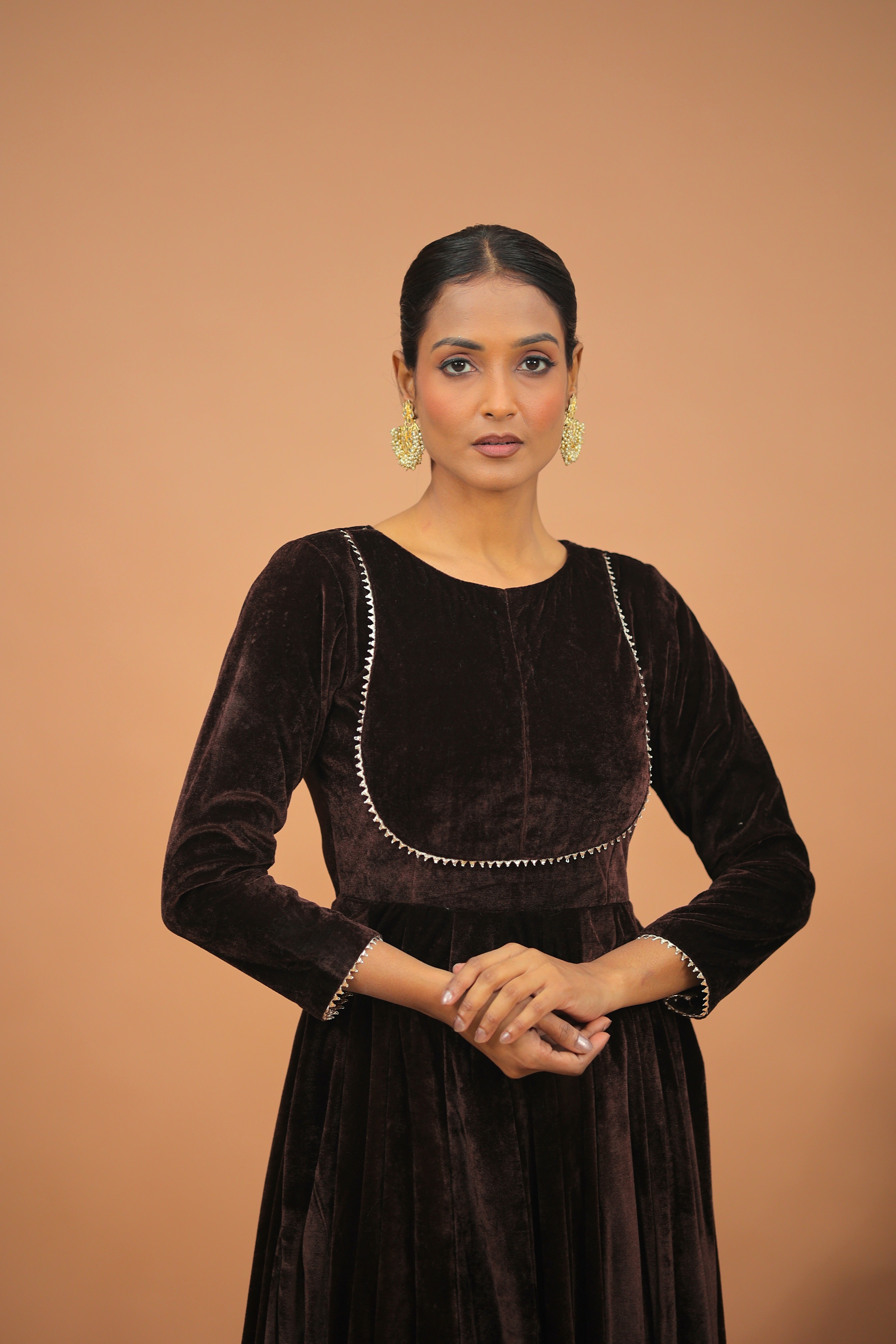 The flowing Velvet Anarkali Set silhouette is elevated with delicate detailing along the neckline and borders, creating a refined balance of richness and grace.